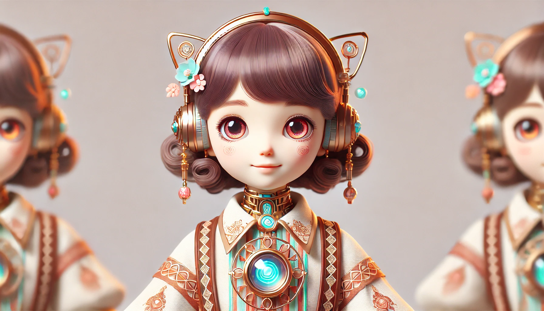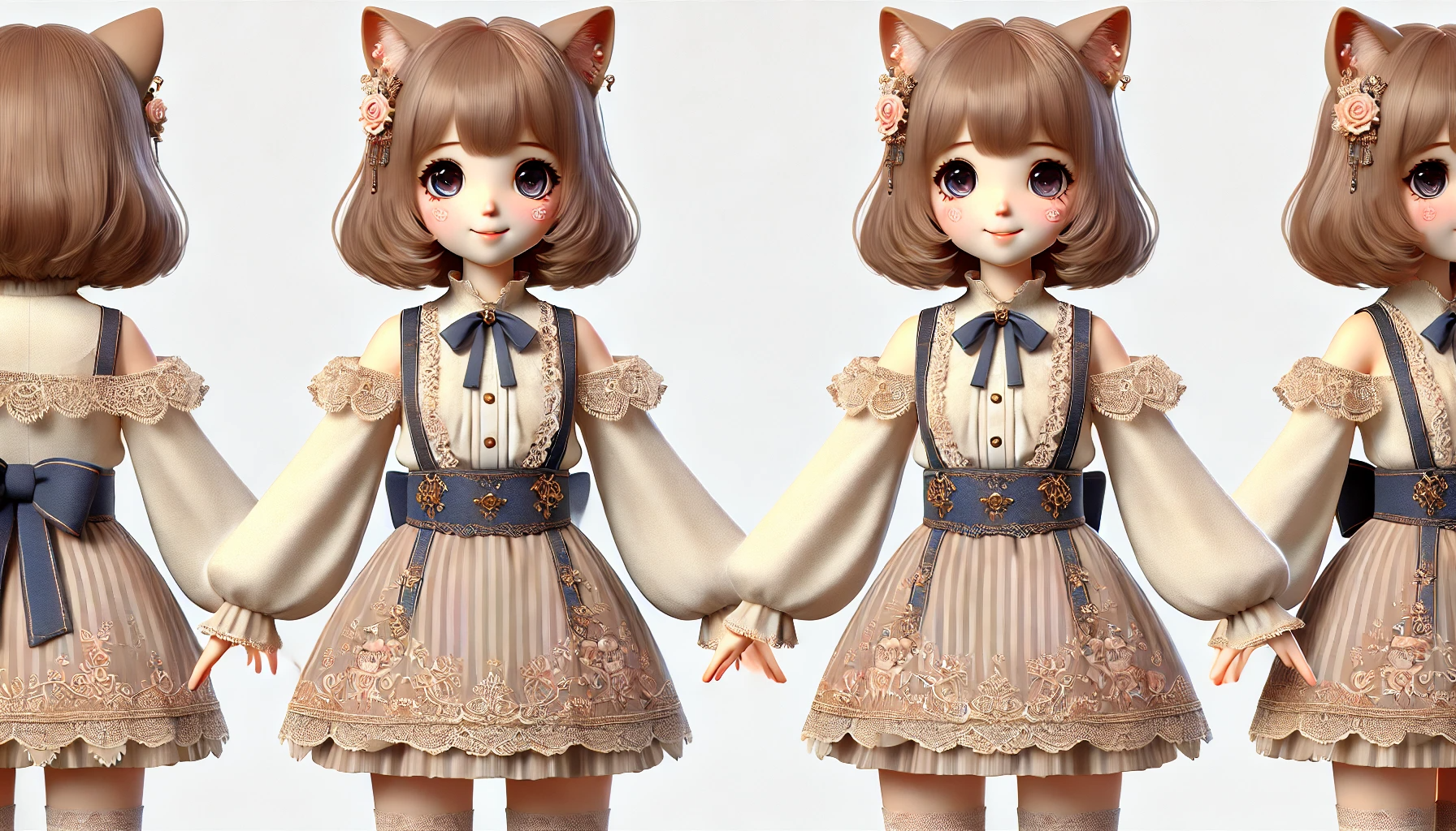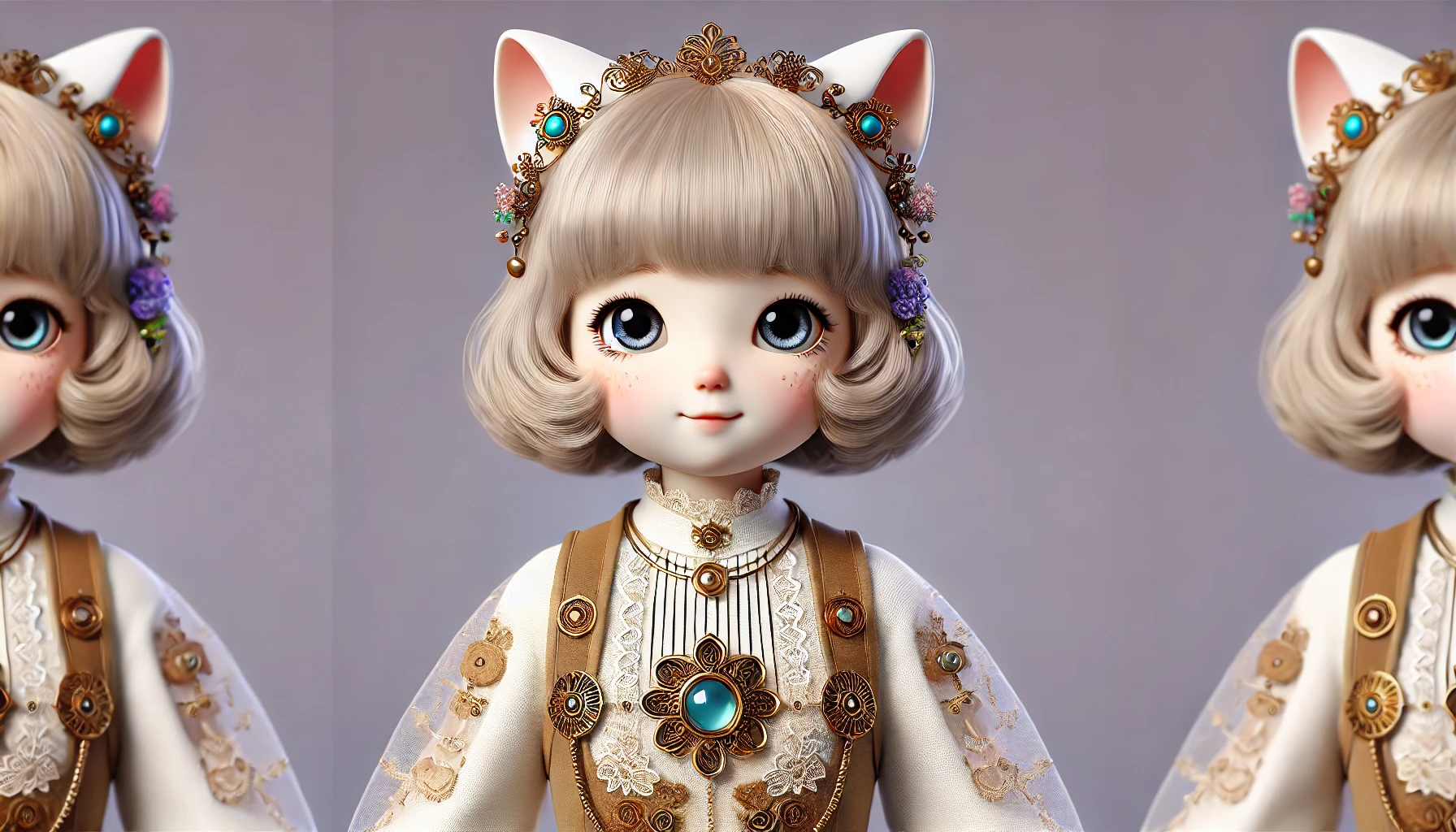 인간형 안드로이드. 여자 어린이 외형. 귀여움. 화려하고 장식적인 옷을 입은. 빈티지 스타일에 레이스와 세밀한 디테일을 더해 더욱 사랑스러운 느낌을 강조.